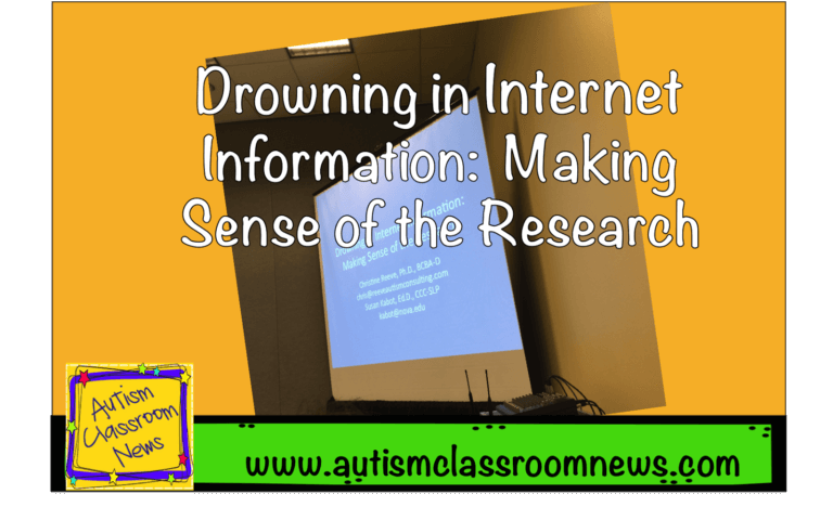 I’ve discussed evidence-based interventions in the past and some processes for evaluating interventions in previous posts HERE. I don’t want to repeat all of that but I do want to add some thoughts that resulted in this particular talk. I’m sure many of you have the experience of many people, from students’ parents, to administrators, to your own family who share newspaper and magazine articles and websites about the next great intervention for autism. There is so much information out there that it’s very difficult to know what you can trust. The presentation we did talked about the way we, as human beings, process information and make decisions and different decision models that we make. As educators and other related professionals, we have an obligation to make decisions about interventions based on research that has shown them to be effective. We then have a continuing obligation to determine if those evidence-based practices are appropriate and effective for our clients and students by evaluating the data produced when we apply them.