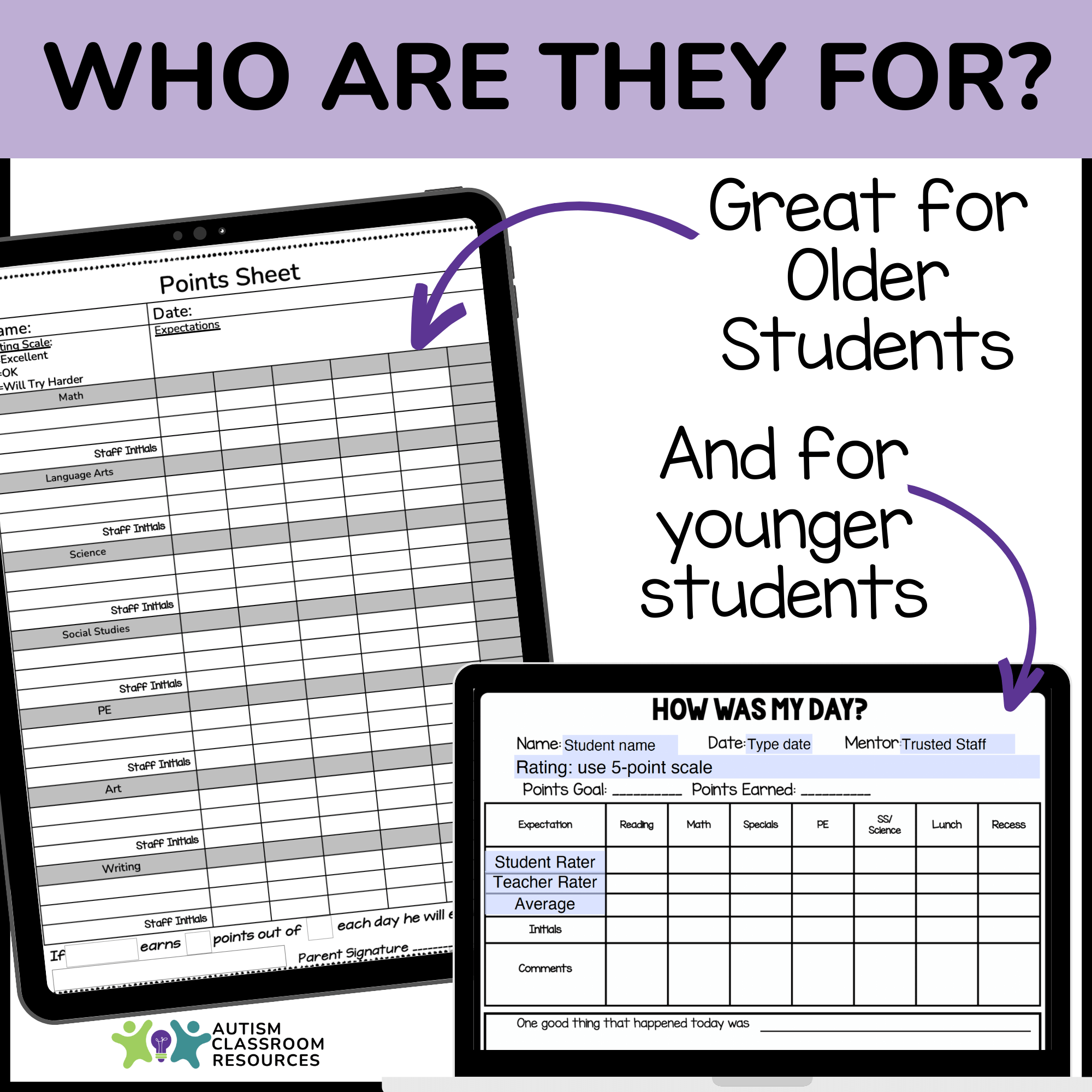 - Students in special education and general education classrooms who would benefit from learning to self-monitor their own behavior or would benefit from tracking behaviors on a point sheet daily.