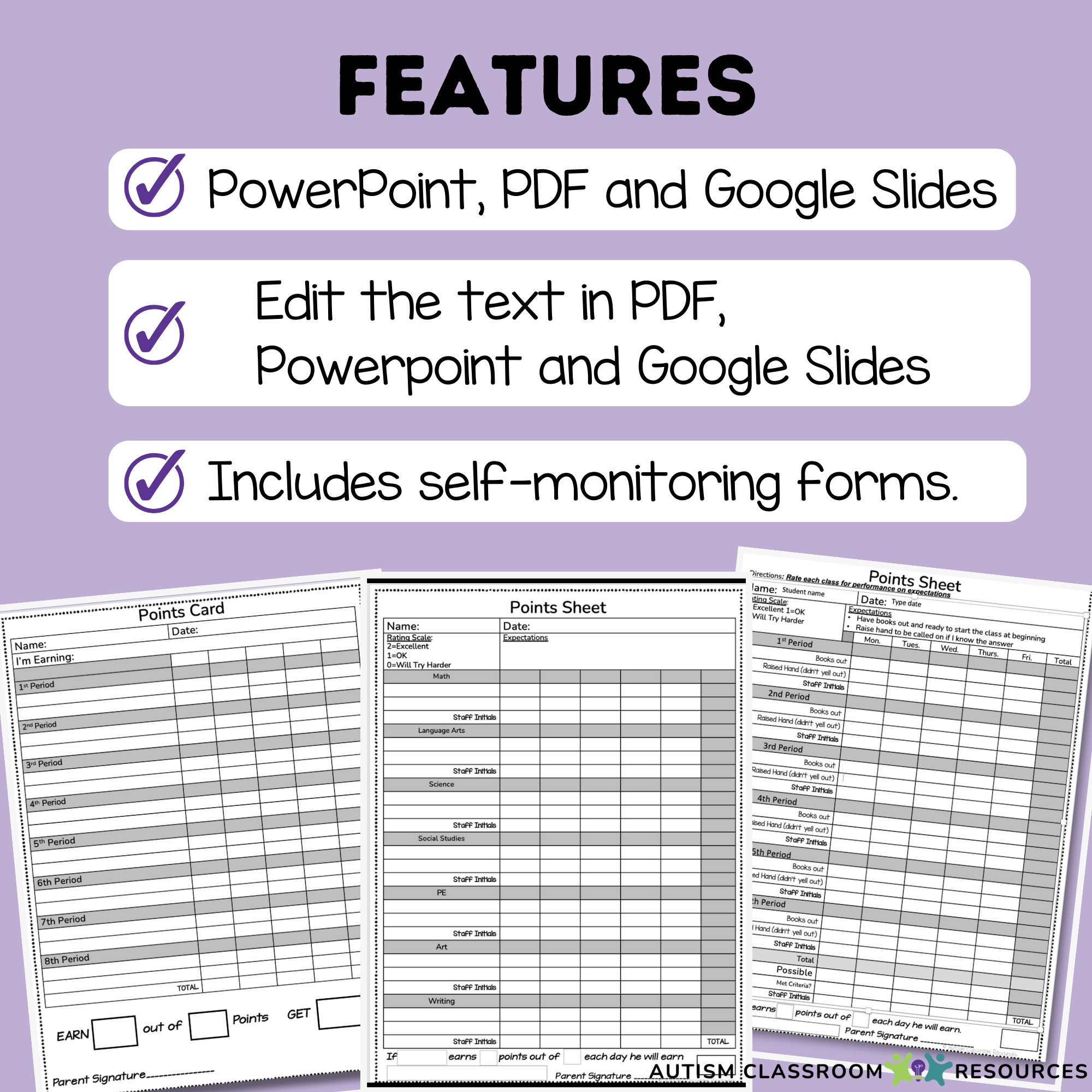 โค๏ธย Editable Behavior Points Sheets: Being able to adjust the behavior point sheet to the needs of your student is critical with behavioral support.ย You can easily customize and personalize them using Google, PowerPoint, or PDF formats. This flexibility allows you to create an individualized student points sheet with clear behavior expectations, help improve student behaviors and help students meet their behavioral goals. The secondary points sheets include ways to track behavior through staff report by each class period.ย ย Check out the preview for information about what is editable with the forms.