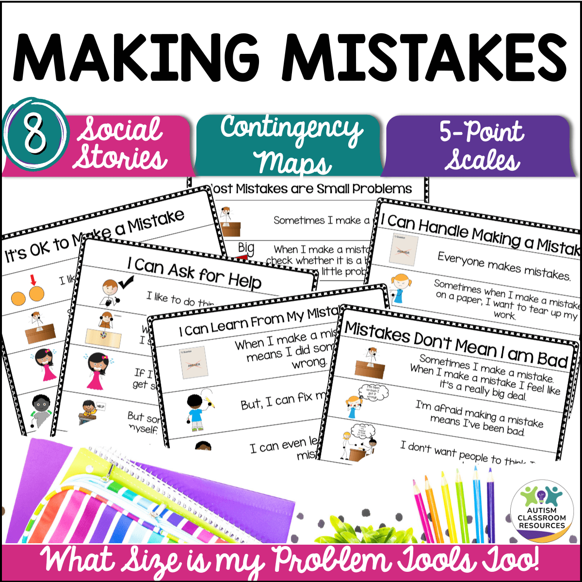 Inside, youโll find six engaging social stories, plus contingency maps, 5-point scales, and graphic organizers to help students develop a growth mindset. Each social story is provided in two formats (1-page and book format) and highlights common challenges students face when dealing with mistakes that may lead to problem behaviors.