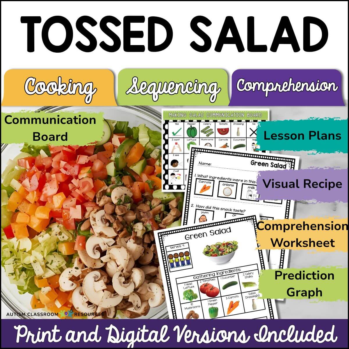 Looking for an interactive life skills cooking activity that keeps students engaged and working independently? This tossed salad unit is a great way to bring real-world experience into your classroom while supporting individual participation. Using visual recipes and built-in comprehension supports, students can follow each step, handle their own ingredients, and build confidence in the kitchen.