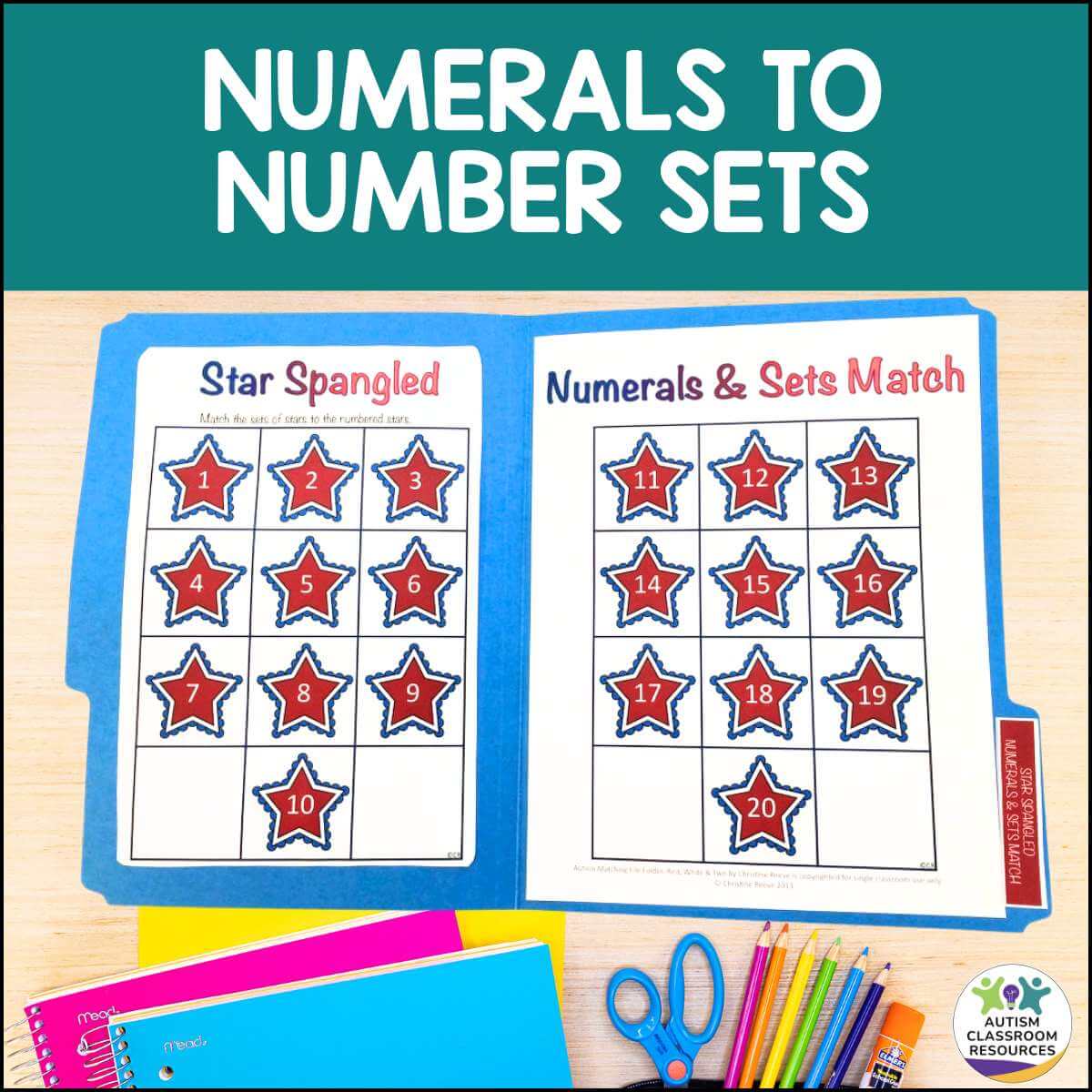 Whether you’re working on 1:1 instruction, independent work systems, or classroom centers, these matching number file folder games help students focus on key skills like identifying numerals, counting sets, and connecting number words—all without extra distractions. Each number appears on the same color star to ensure students are learning the actual skill of matching numbers, not matching by color or design.