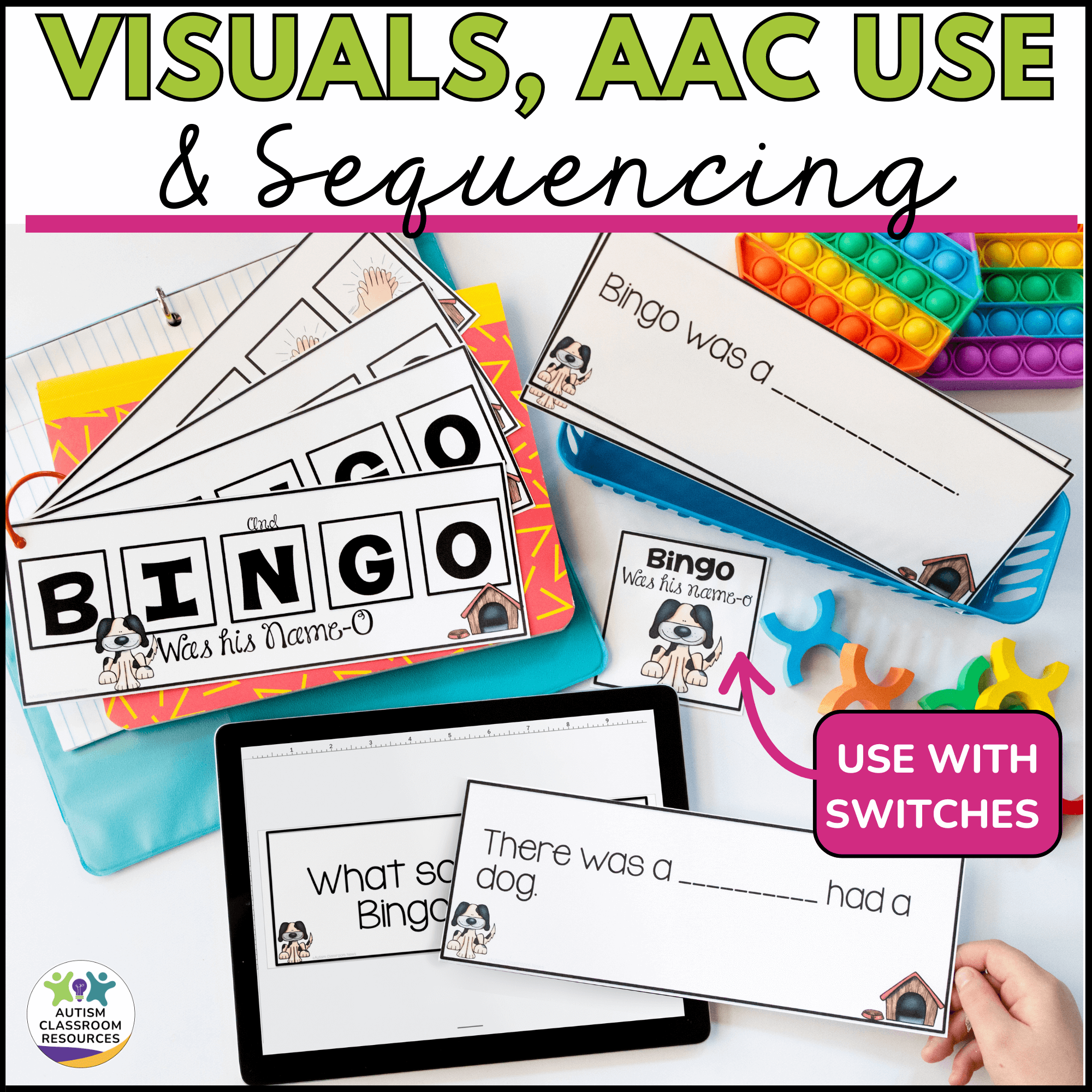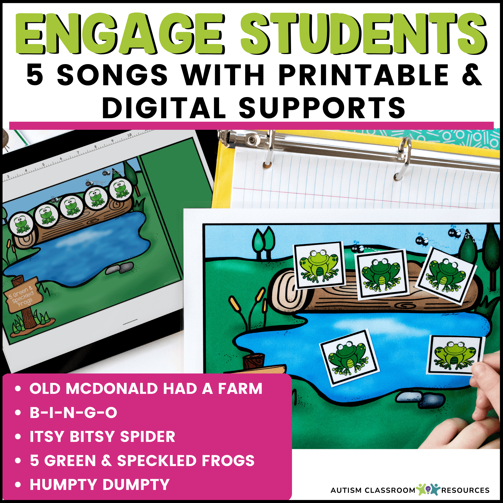 This printable and digital kit includes 5 familiar songs and rhymesโBINGO, Humpty Dumpty, 5 Green and Speckled Frogs, Itsy Bitsy Spider, and Old McDonaldโs Farmโpaired with colorful visuals that support communication, engagement, and participation for all learners. Whether you’re working with preschoolers or early elementary students, you’ll have flexible tools to support choice making, comprehension, counting, and more.