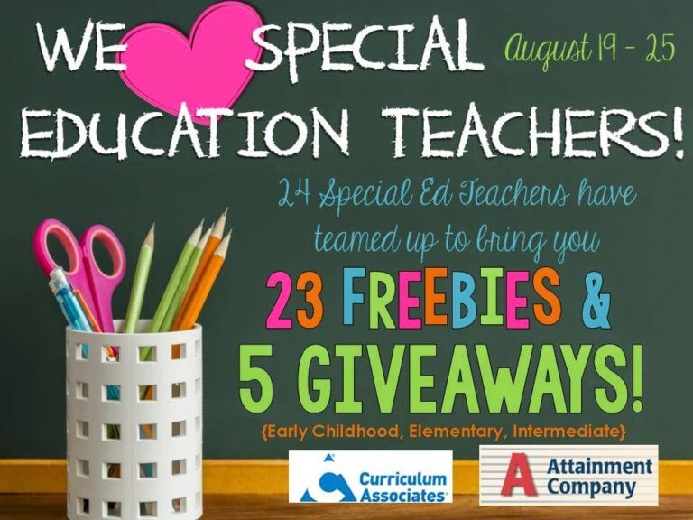 I am super excited about this week! So much is going on! First we have this awesome giveaway and tomorrow is a TPT one-day boost sale!! Whoo hoo! I am particularly excited about this post because this is a blog hop designed and brought to you exclusively for special education. So often we have to adapt or choose the things that will work for our classrooms, but not this time. This time the freebies and the giveaways are JUST FOR Special Educators. That’s not to say that others can’t use them-because we special educators know that everything we do can be effective for all students, not just special education. So, let’s show them how it’s done! Check out the awesome giveaways below (I have one in each age group because you know how important I think it is for all ages to have cool learning stuff! Then check out the freebies at the end of the post and hop over to the next blog for more freebies–rinse and repeat 24 times!