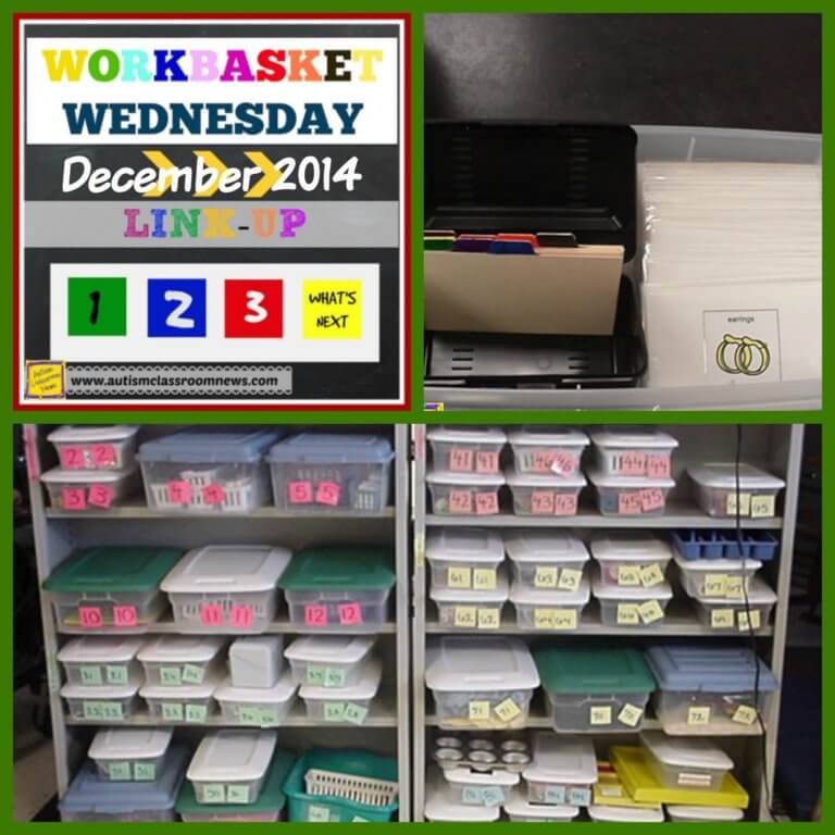 Above is the overall system. You see the tasks on the shelves. On the board on the right you see days of the week. It’s not a great picture (sorry, it’s old before digital film, don’t judge), but you will see little pieces of yellow paper next to the days of the week. Those papers are students’ names and underneath each name are the numbers of the baskets that each student will do that day. This allows anyone, including peer buddies who come into the room, to set up the systems for the students who are not able to get their own tasks. Some students actually check this schedule or a list made from this schedule and get their own tasks, take them to their desk, complete them and then put them in a finished area. I really love this type of system because if you have all the tasks in boxes or bags with permanent numbers, you can keep a running list of all the tasks that each student has mastered and can complete independently. That makes lesson planning easy–you just put the numbers into your lesson plans. If you don’t have room or money for boxes for every task, you can store ones you aren’t currently using in ziplock bags and put the numbers on them. Then dump them in bins when you need them.